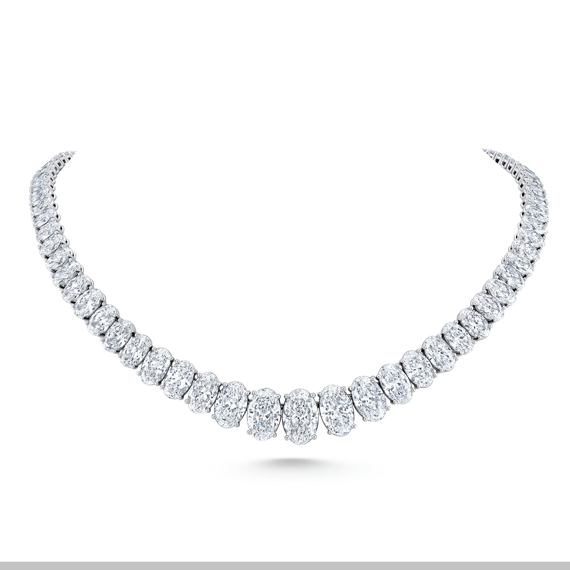 Experience unparalleled elegance with the Oval Graduated Diamond Symphony Necklace, a certified masterpiece crafted in luxurious platinum. Featuring a harmonious arrangement of oval diamonds in a graceful graduated style, this necklace showcases brilliance in every detail. The diamonds boast a pristine D to F color range, ensuring exceptional sparkle and timeless sophistication.