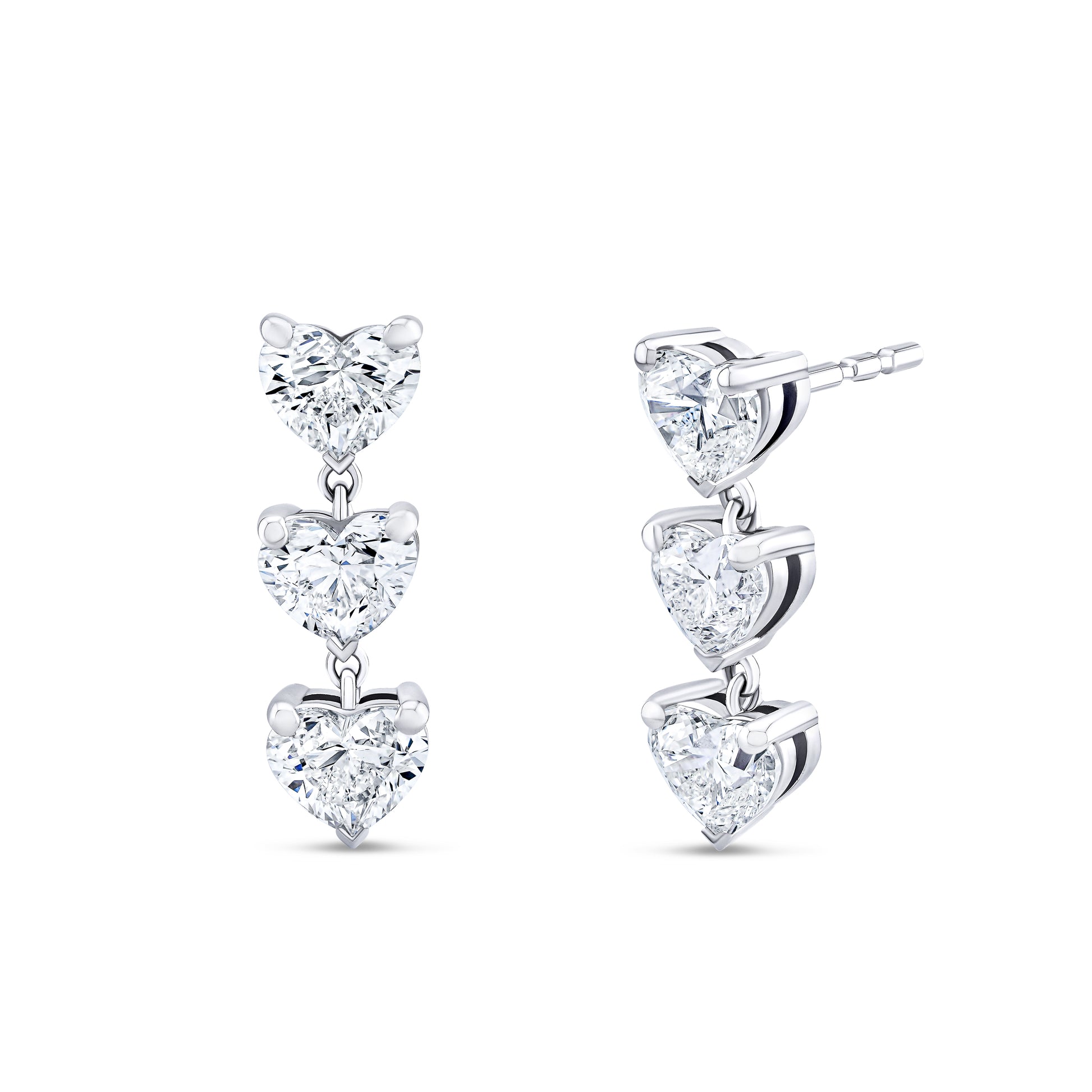These triple drop earrings feature six heart-shaped diamonds totaling 2.46 carats, set in 18k white gold. Their delicate movement and romantic silhouette make them a timeless, luminous statement.