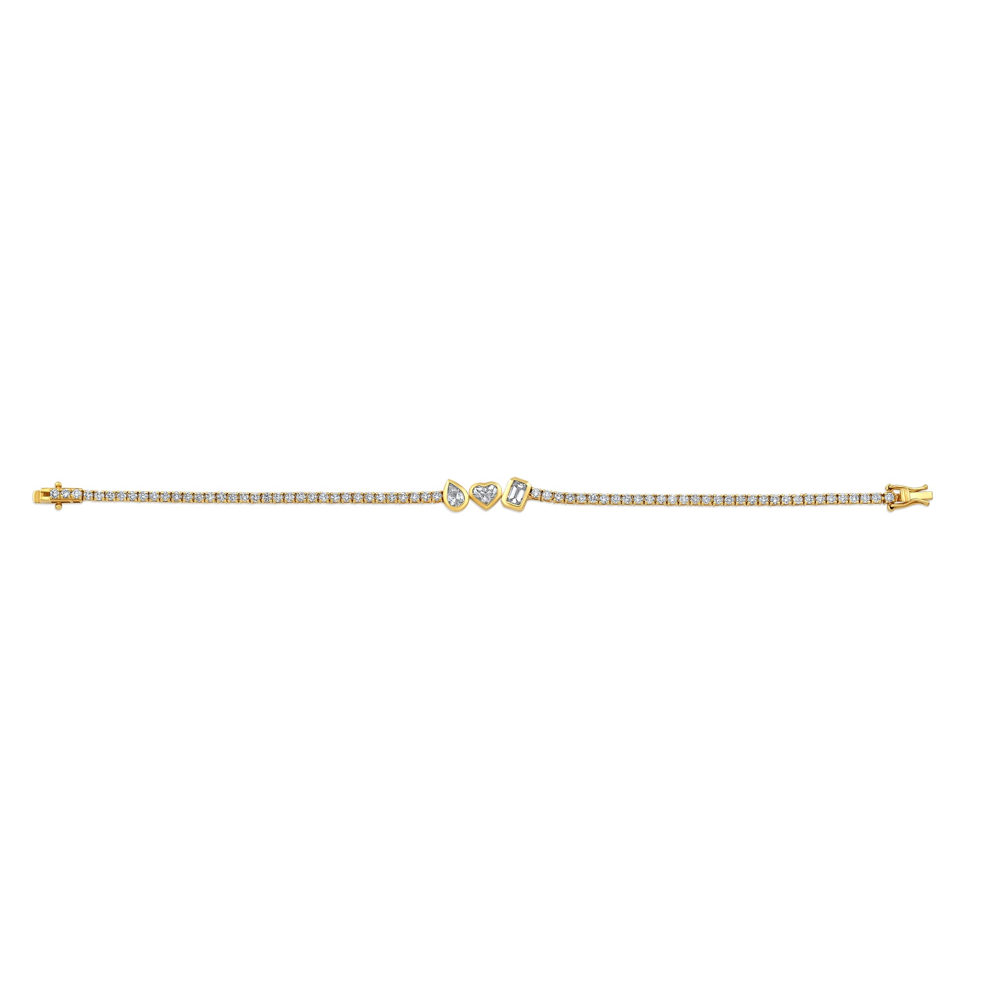 Add a touch of luxury with our Triple Fancy Shape Accented Tennis Bracelet. Crafted in 18k yellow gold, this bracelet features stunning, uniquely shaped accents, offering a perfect blend of elegance and modern sophistication for any occasion.